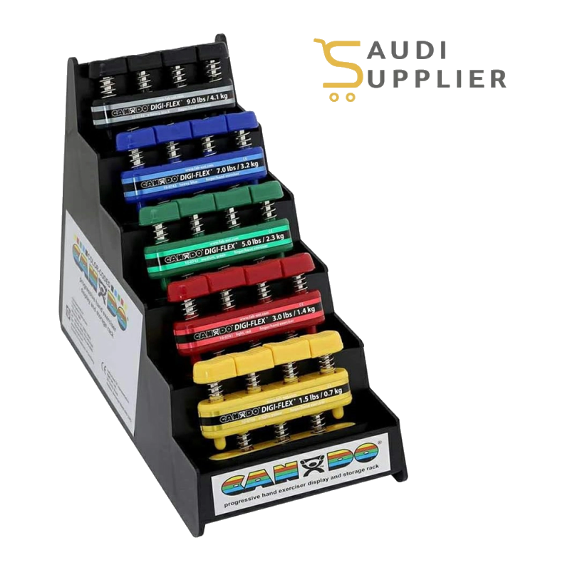 The CanDo® Digi-Flex® Hand Exerciser Set – Model 100746 is a professional finger, hand, and forearm strengthening system designed for rehabilitation, occupational therapy, and fitness training. This complete set includes five color-coded resistance levels (yellow, red, green, blue, black) along with a convenient plastic storage rack for organized clinical use.
